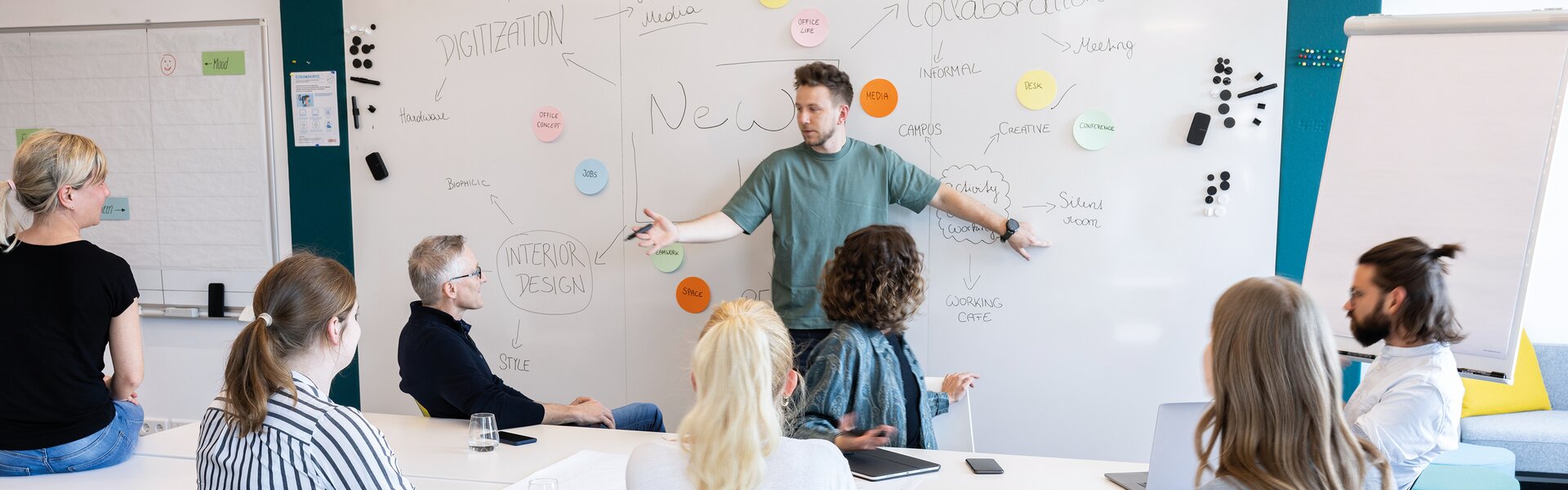 Die kreative Kommunikation zur Ideenentwicklung – in Form von Workshops oder Projektmeetings – verlangt nach einem inspirierenden Umfeld, in dem die Gedanken fließen können. Abseits des traditionellen Schreibtischdenkens. Im Gegensatz dazu präsentiert sich das Umfeld für klassische Meetings oder Konferenzen, die aus dem Workflow heraus entstehen, statischer und sachlicher, aber dennoch mit einem großen gestalterischen Spielraum: von einfach-funktional bis hin zu hochwertig-repräsentativ.