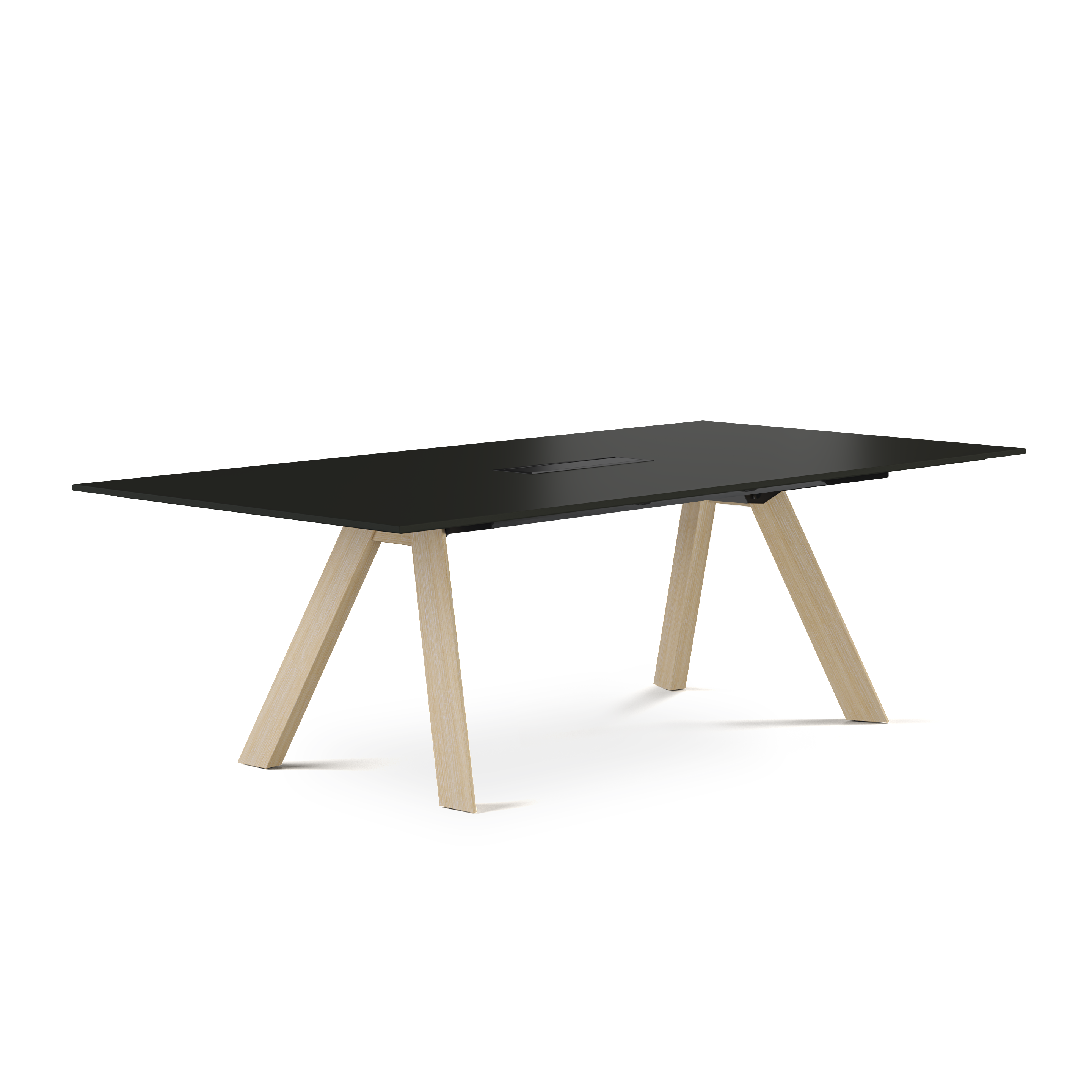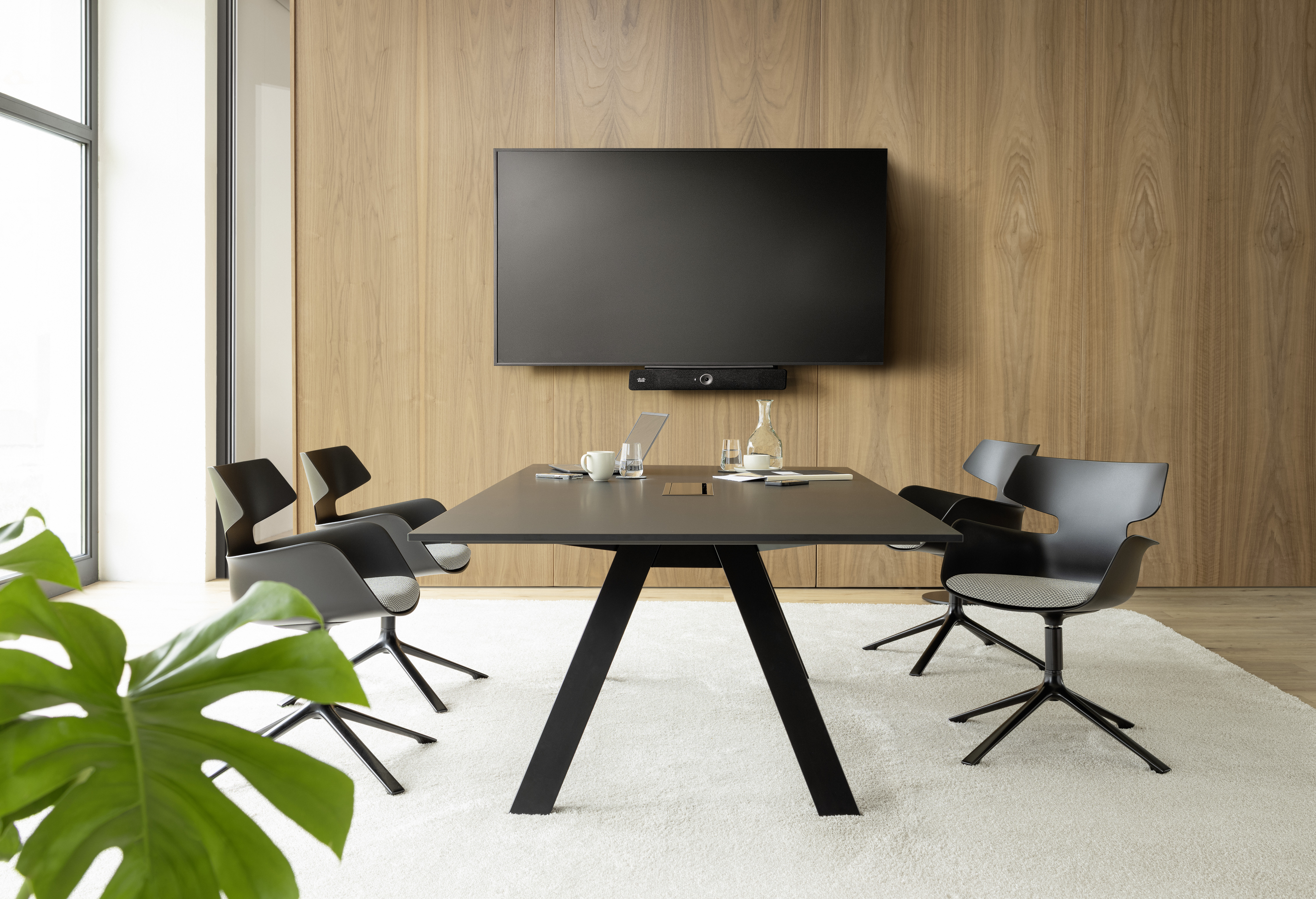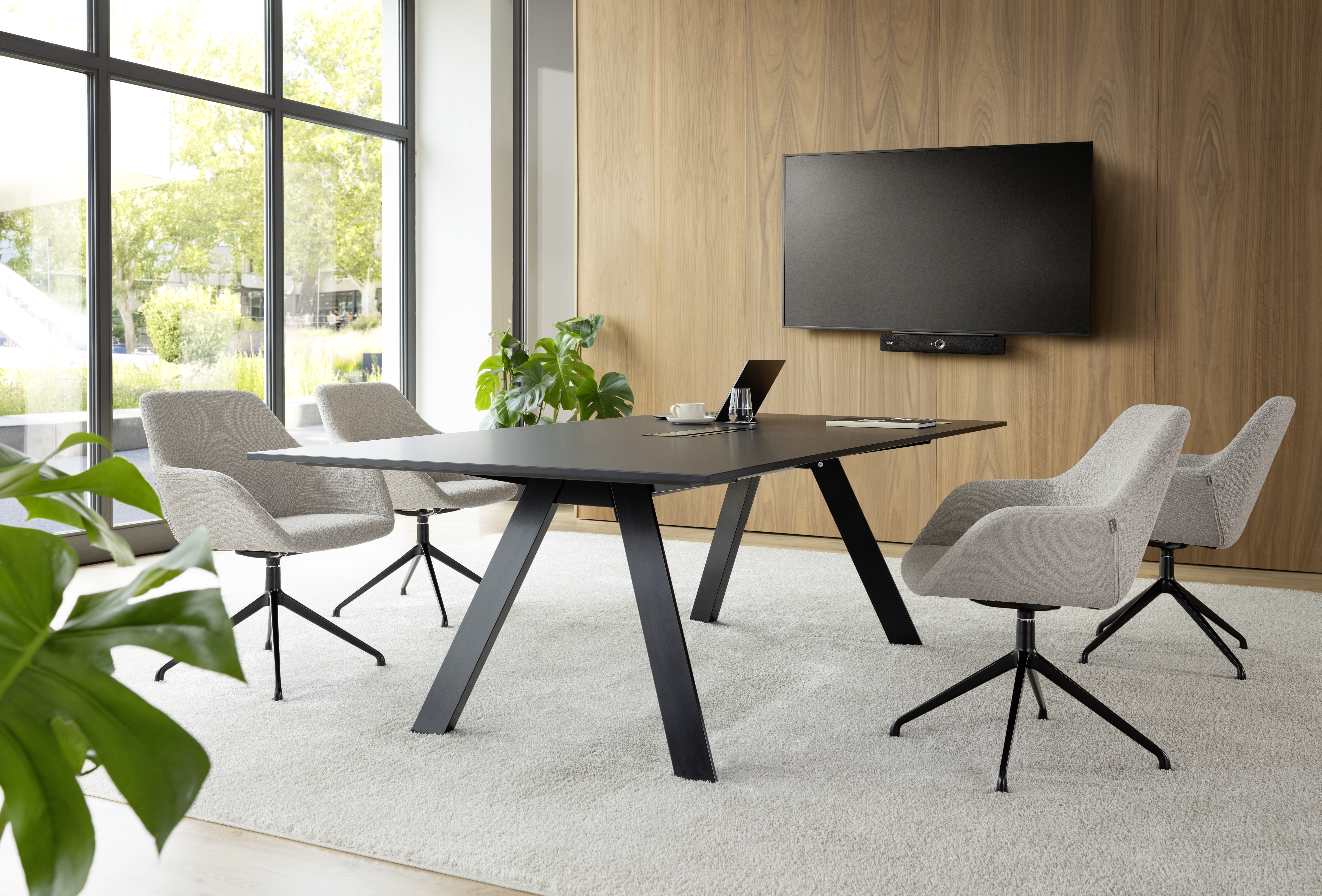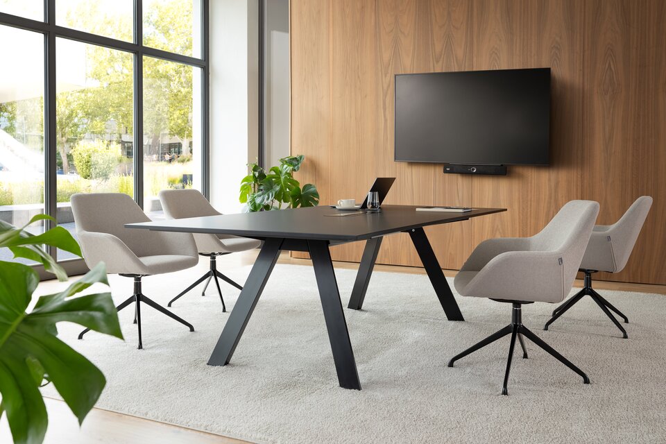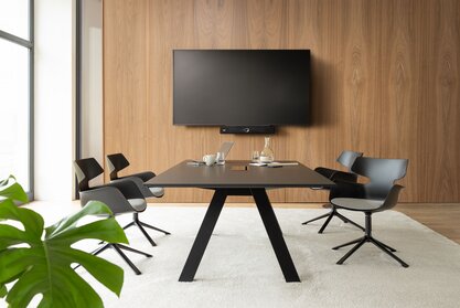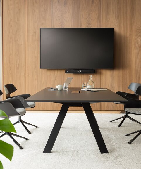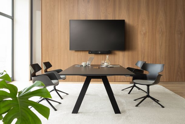 Zur Wahl stehen mehrere Tischformate als kompakte Einzeltische sowie großflächige Doppeltische mit bis zu 140 x 480 cm für 14 Personen. Der Doppeltisch wird durch einen Mittelfuß verbunden und garantiert eine hohe Stabilität des Tischsystems. Eine durchdachte Kabelführung sorgt für die unkomplizierte Integration moderner Medientechnik – für effiziente Meetings und Videokonferenzen ohne Kabelsalat.