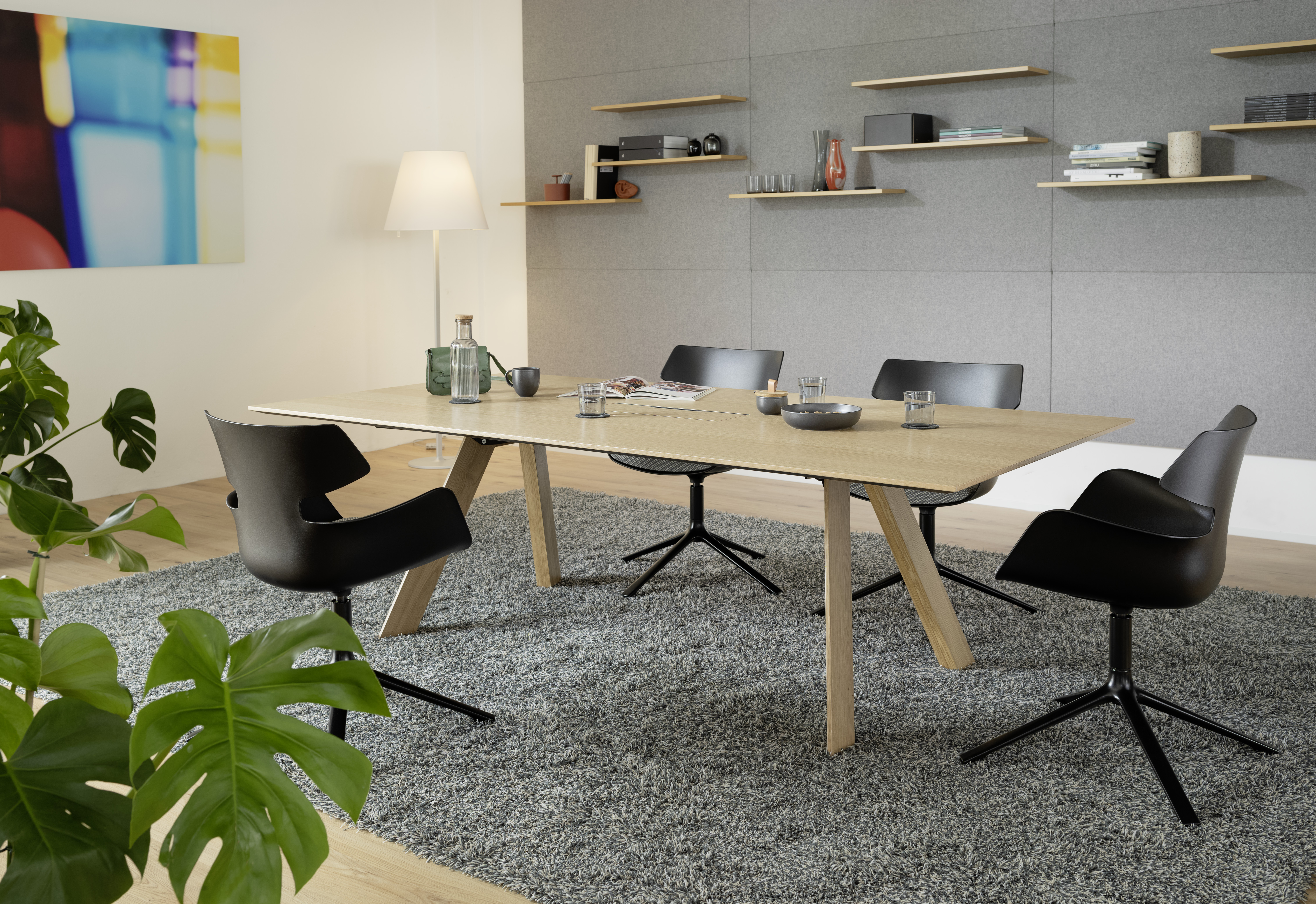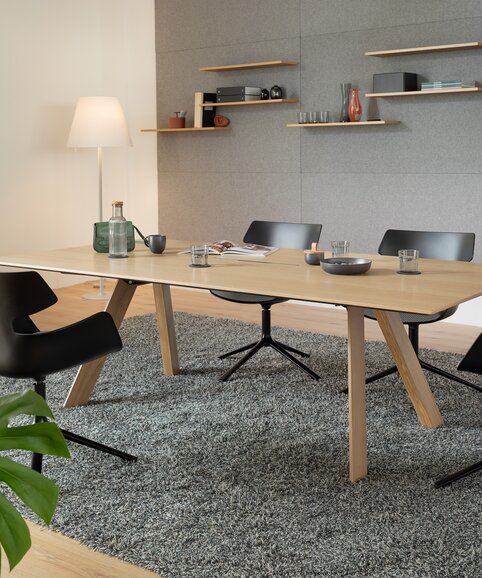 Das Erscheinungsbild ist reduziert und zurückhaltend – für eine ungestörte Kommunikation. Holz als maßgeblich sichtbares Material sorgt für stimmige Atmosphäre in Konferenzräumen und bringt mehr Wohnlichkeit ins Büro. Die besonderen Merkmale von delv sind die Tischplatte mit einer leichten und schwebenden Anmutung sowie das A-förmige Gestell. Die zentrale Positionierung sorgt für exzellente Beinfreiheit und ermöglicht so komfortables Sitzen sowohl an der Längs- als auch an der Stirnseite.
