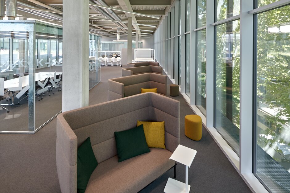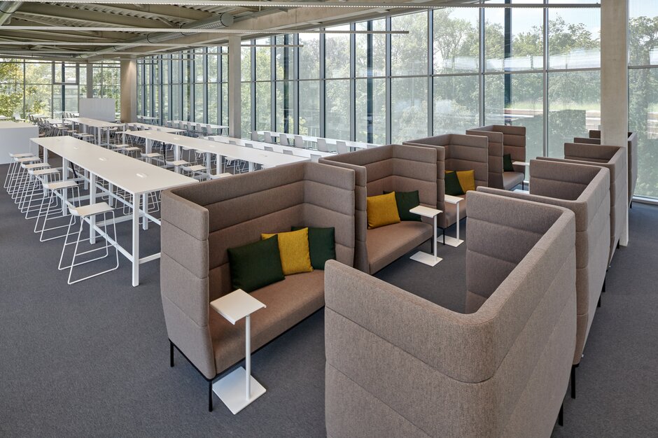 Three room-in-room cubes allow tutoring (Distribute) and presentations for up to eight people. Stimulated discussions and joint development of learning content take place here without disturbing colleagues while they are engaging in highly concentrated learning. Online meetings and webinars can also be held from here. Thanks to the use of glass and steel girders, which can be found throughout the room concept, the cubes adapt in an architecturally seamless manner to their learning environment. In addition to these cubes standing openly in the room, a seminar room for up to 16 people is available in which presentations and lectures can also take place. The use of mobile yuno stacking tables and nooi series chairs allows the room to be converted into a small event or creative room within just a few minutes.