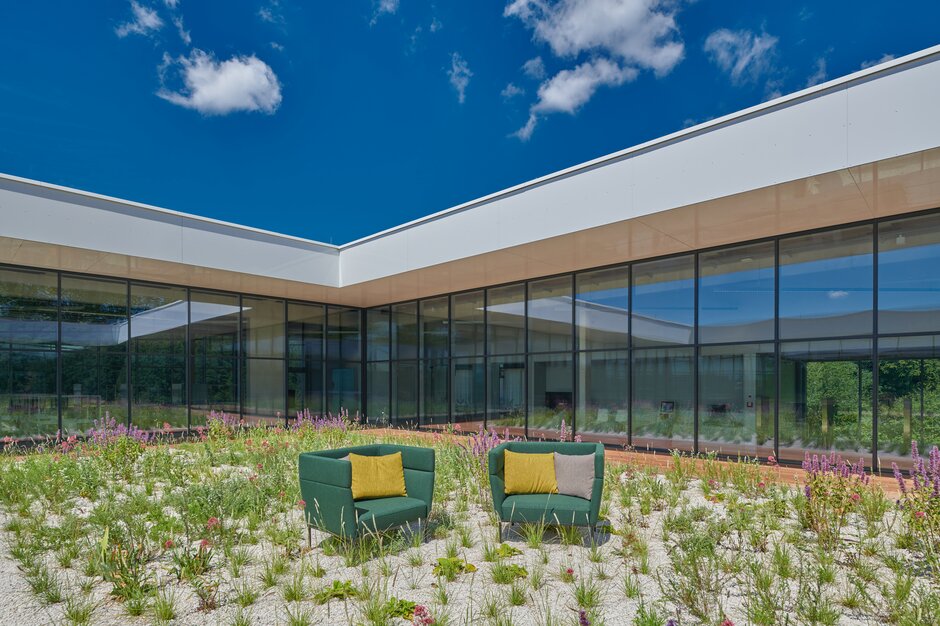 When one goes up the wide steps of the radiating outside staircase of the new JKU annex, one is not awaited by a concrete park or plastic sculptures, but by a wildly growing meadow of flowers that is inviting both for bees and for students. It is enclosed by a heat-providing wooden terrace and the glass fronts that grant a panorama of the new Learning Centre of the Johannes Kepler University in Linz. From there, several doors lead into the interior of the storey-adding building, with which an architecturally modern place of wellbeing was created on the library building from 1984.