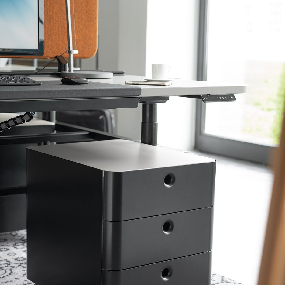 Estéthique, ce caisson sur roulettes peut accueillir les affaires personnelles dont on a immédiatement besoin. Son design caractéristique est très épuré : La tôle d’acier habille une structure de haute qualité. Les caissons etio se présentent sans poignées : Des orifices de préhension prédécoupés sont intégrés dans la façade des tiroirs.